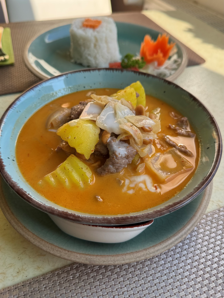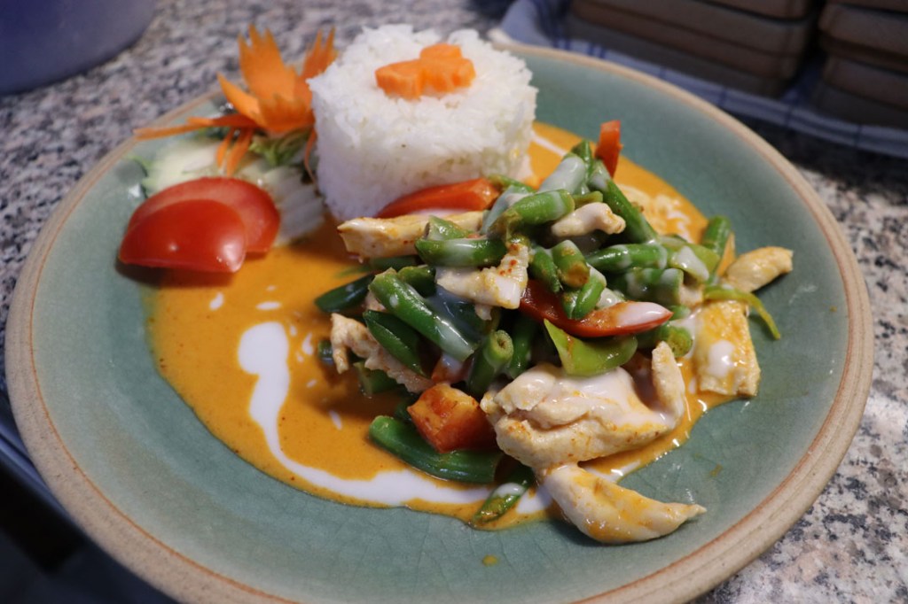 Gebratener Reis mit grünem Curry, Kokosmilch, Bambus, Auberginen, langen Bohnen, Peperoni & Basilikum