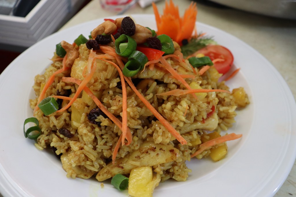 (Fried Rice with Pineapple, raisins, cashews, hot peppers)