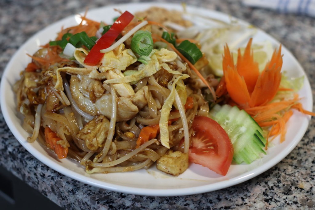 (Fried rice noodles with egg, soya bean sprouts, peanuts, tofu)