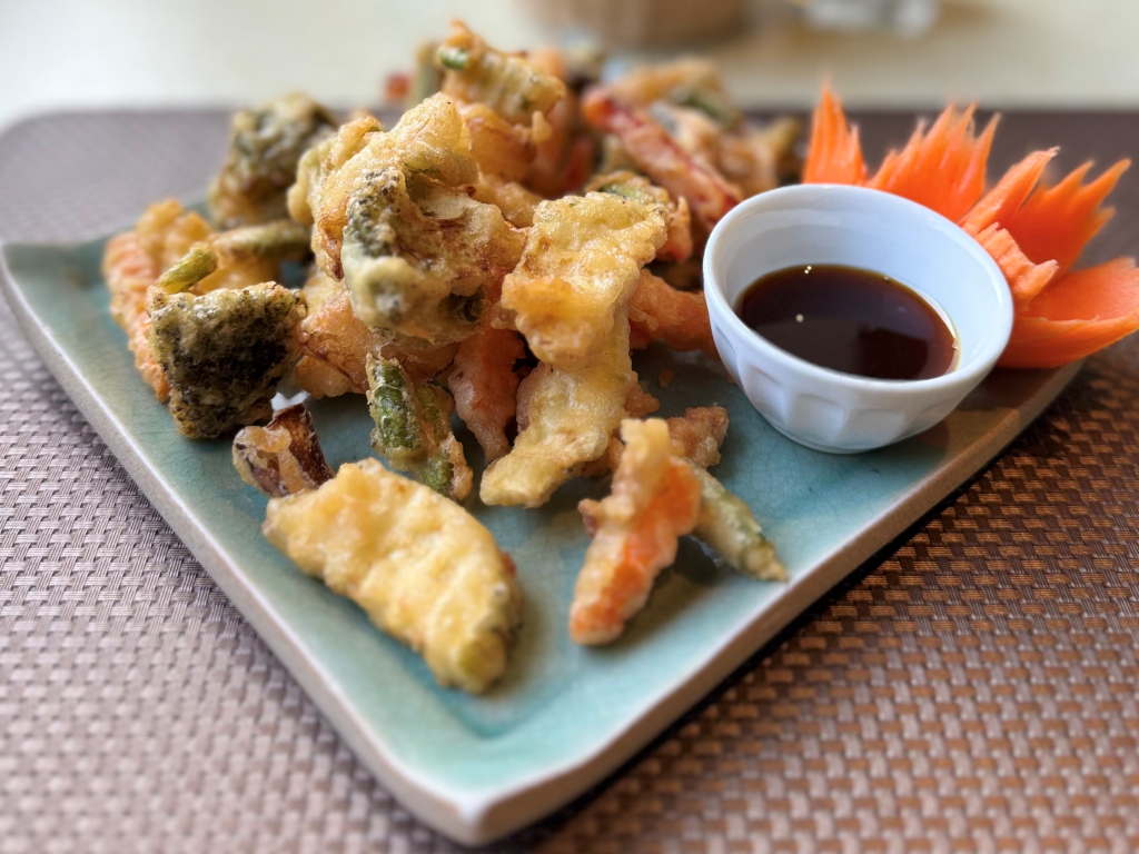 (Deep-fried vegetables with soya-ginger sauce)