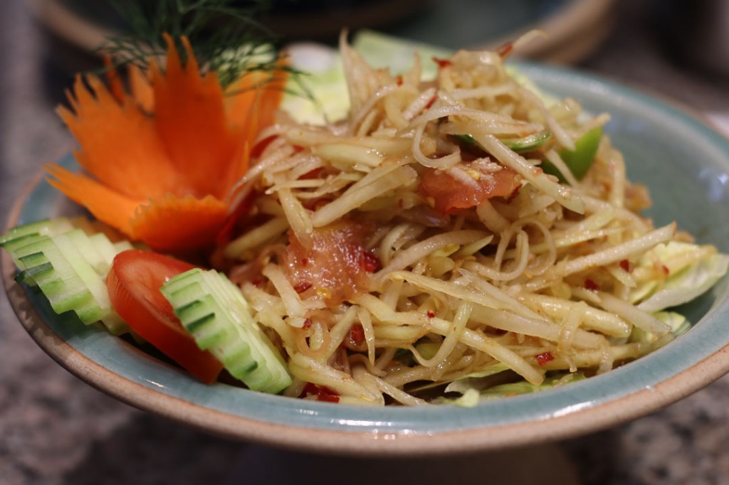 (Papaya salad with tomatoes, string beans, peanuts, Chilli)